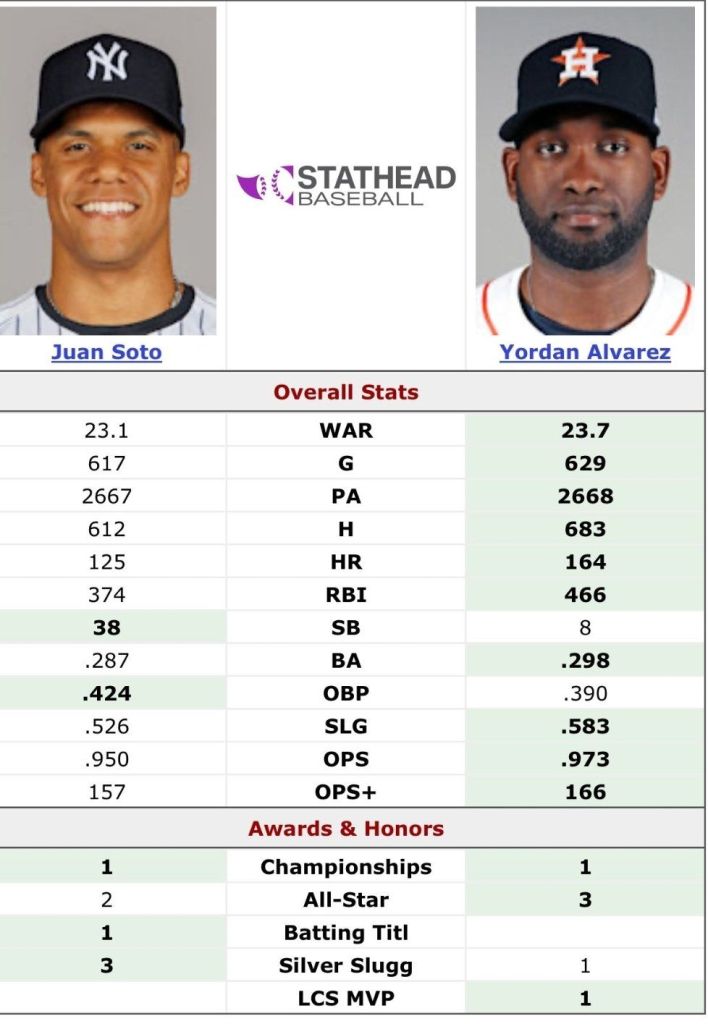 With the case that has been presented how can one not say that Yordan Álvarez is not only in Soto’s class but maybe even the superior player. The case has been presented and the numbers are in the open, feel free to make your determination and choose the better of the two players.